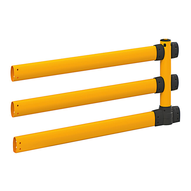 Naast de dikkere dwarsbalken op voertuighoogte beschikt deze uitvoering over een extra balk onderaan. Hierdoor biedt het systeem niet alleen bescherming tegen voertuigen, maar ook tegen heftruckvorken, banden en lage aanrijdingen.